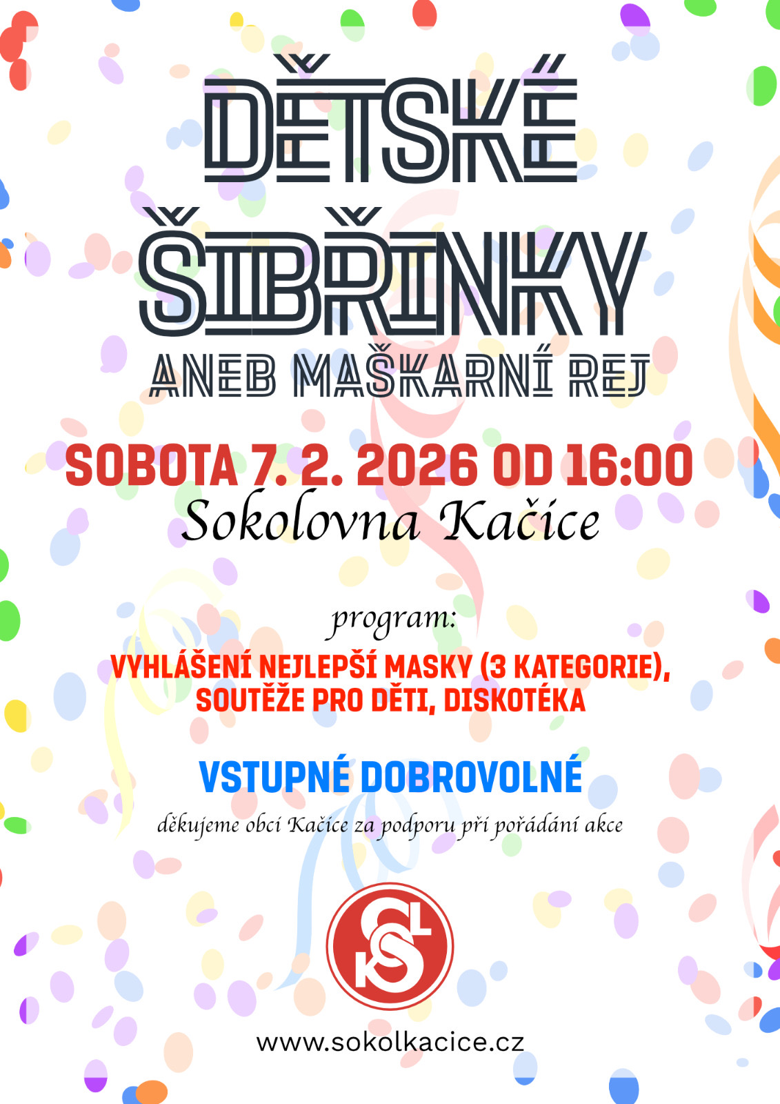Přijďte si 7. února s dětmi užít zábavné sobotní odpoledne do Kačice! Pro děti jsou připravené soutěže, diskotéka, vyhlásíme nejlepší masky ve třech různých kategoriích. Vstupné na akci je dobrovolné. Děkujeme obci Kačice za podporu při pořádání akce!