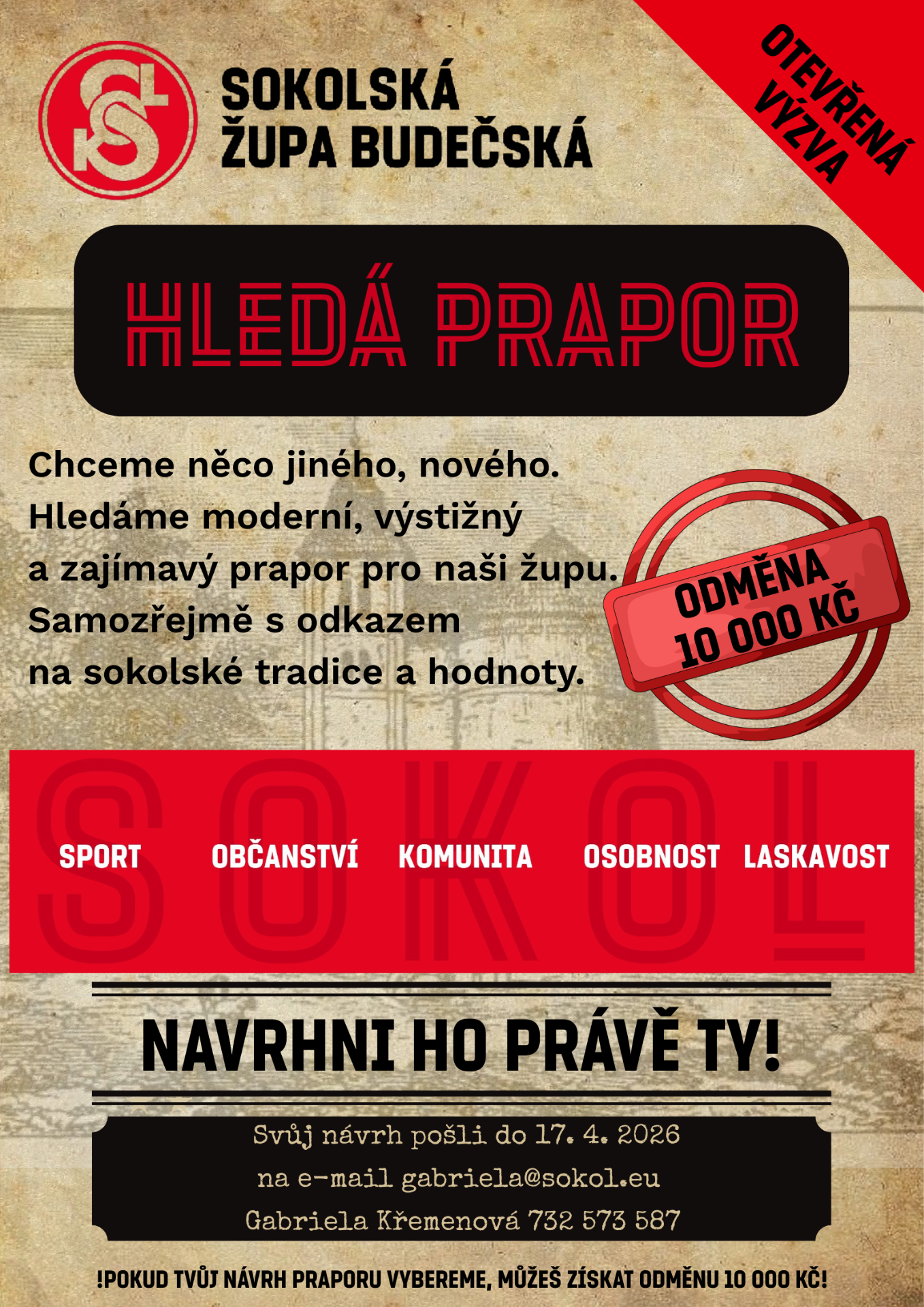 Chceme něco jiného, nového. Hledáme moderní, výstižný a zajímavý prapor pro naši župu. Samozřejmě s odkazem na sokolské tradice a hodnoty. Navrhni ho právě ty! Svůj návrh pošli do 17. 4. na e-mail gabriela@sokol.eu. Pokud tvůj návrh praporu vybereme, můžeš získat odměnu 10 000 Kč! Podrobnosti k výzvě najdeš v dokumentu níže: