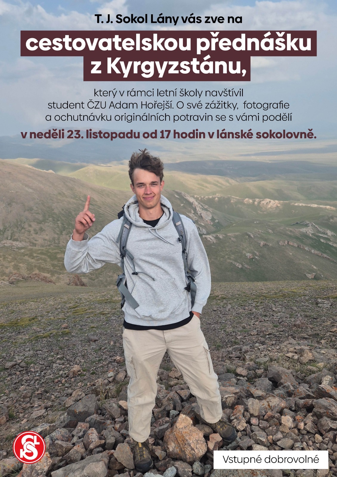 Nenechte si ujít další z cyklu zajímavých cestovatelských přednášek, které pro vás připravuje T. J. Sokol Lány. Tentokrát se podíváme do Kyrgyzstánu, který v rámci letní školy navštívil student ČZU Adam Hořejší. O své zážitky, fotografie a ochutnávku originálních potravin se s vámi podělí v neděli 23. listopadu od 17:00 hodin v lánské sokolovně....