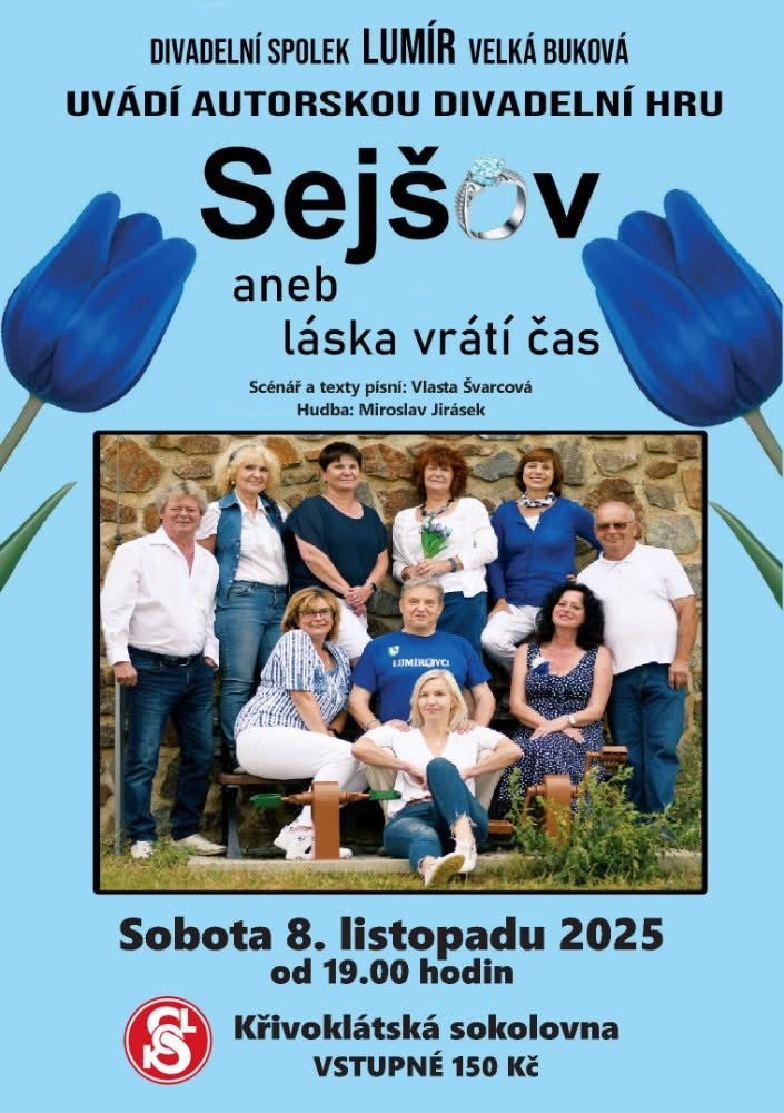Zveme vás na divadelní představení, které tuto sobotu 8. listopadu od 19:00 v křivoklátské sokolovně uvede divadelní spolek Lumír Velká Buková. Vstupné je 150 Kč. Pokud nemáte jiné plány, poznačte si to do kalendářů a dorazte!