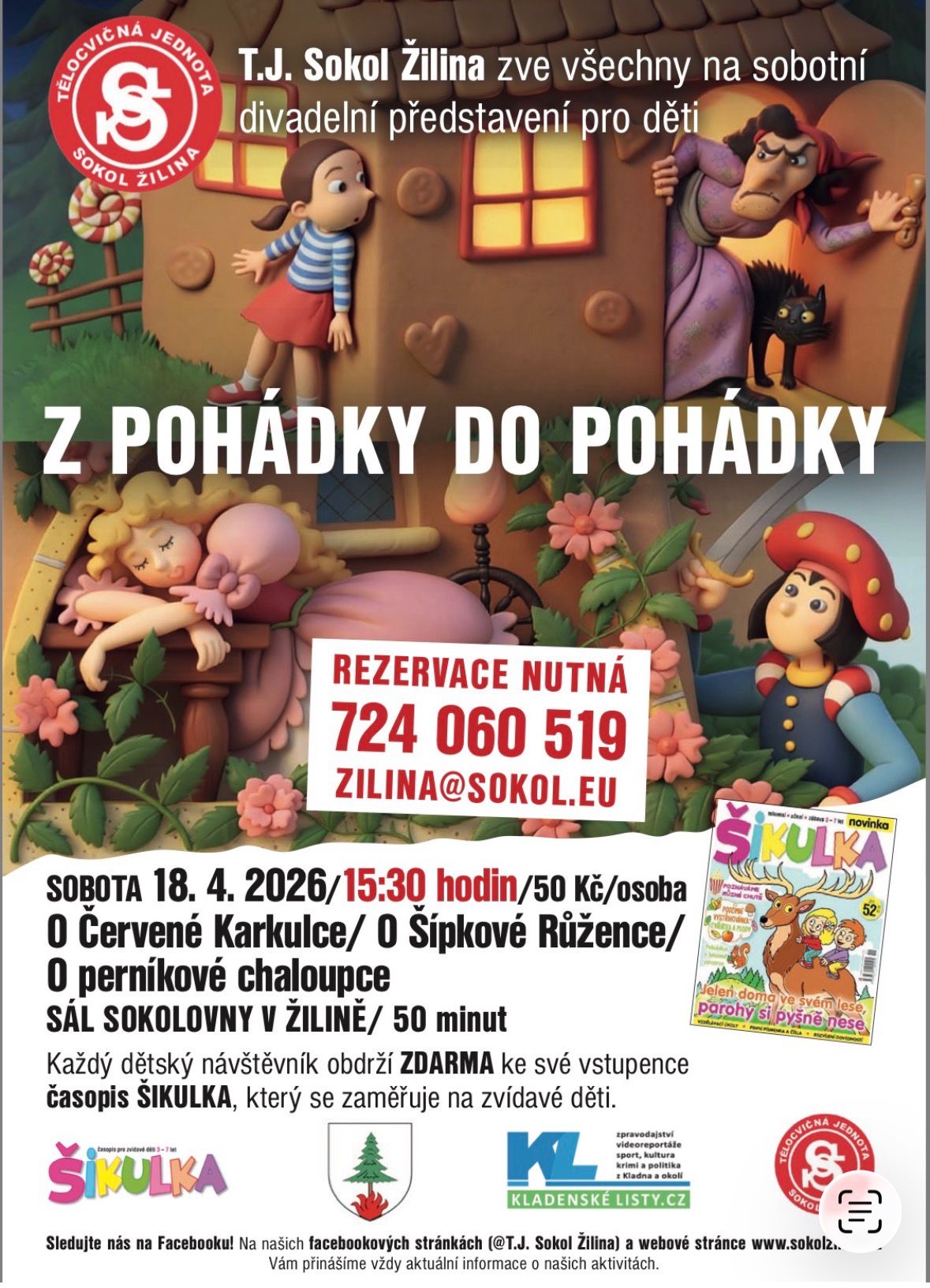 T. J. Sokol Žilina zve děti i rodiče na divadelní představení Z pohádky do pohádky. Malé i velké diváky zaručeně pobaví vtipné zpracování tří nejoblíbenějších pohádek – Červená Karkulka, Perníková chaloupka a Šípková Růženka, které soubor během představení postupně oživí. Představení se koná v sobotu 18. dubna od 15:30 hodin v sálu žilinské sokolovny (Restaurant-penzion Žilina). Prosíme o rezervaci vstupenek na tel. č. 724 060 519 nebo emailu zilina@sokol.eu.