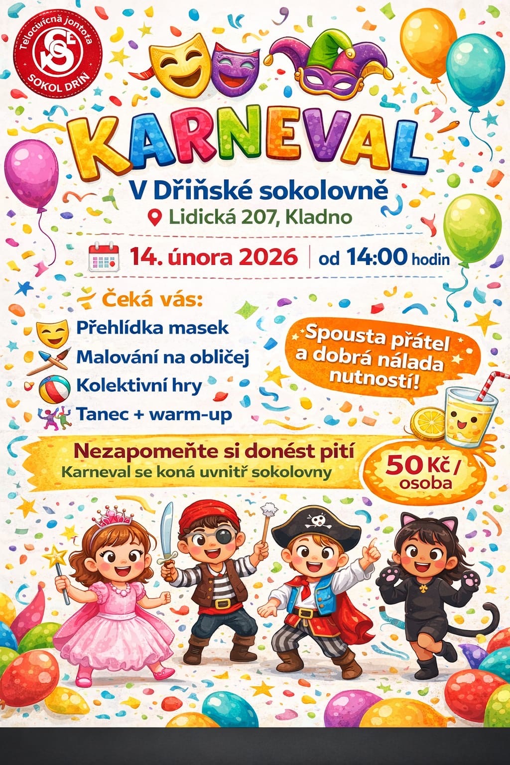 Přijďte si 14. února užít zábavné sobotní odpoledne do sokolovny ve Dříni. Čeká vás přehlídka masek, malování na obličej, kolektivní hry, tanec a warm-up. Nezapomeňte si prosím donést pití! Vstupné je 50 Kč/osobu.