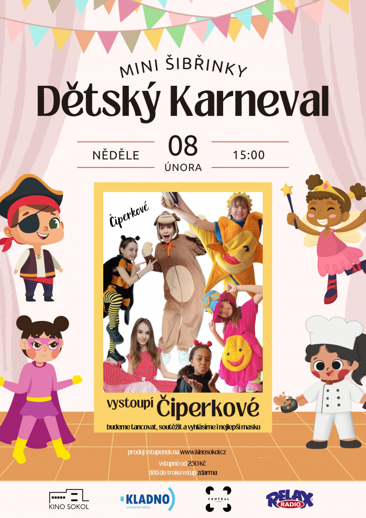 Vstupné od 250 Kč, děti do 1 roku zdarma. Lístky zakoupíte na: https://www.kinosokol.cz/mini-sibrinky-detsky-karneval-a-koncert-ciperku-556
