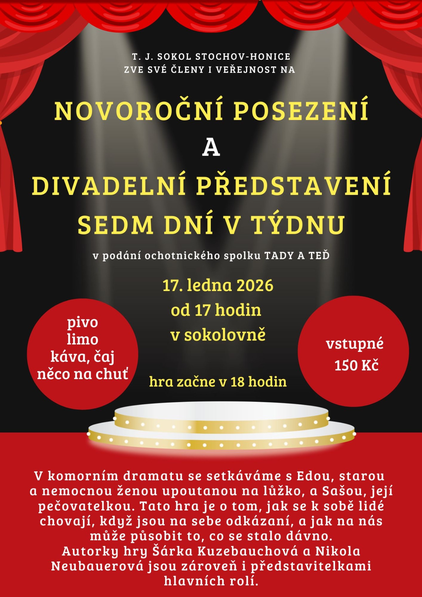 T. J. Sokol Stochov-Honice srdečně zve své členy i veřejnost na příjemné sobotní posezení a divadelní představení Sedm dní v týdnu v podání ochotnického spolku TADY A TEĎ. V sokolovně se na vás budeme těšit v sobotu 17. ledna od 17:00, představení začne v 18:00. Vstupné je 150 Kč.
