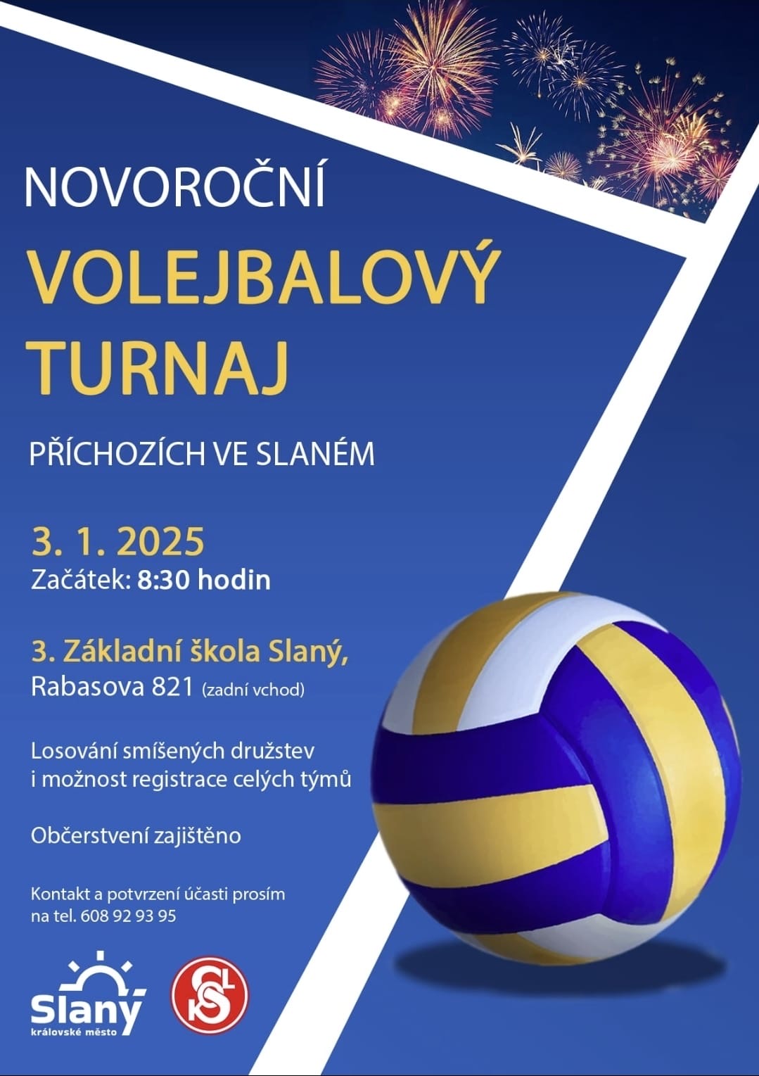Je tu nový rok a s ním i první volejbalový turnaj příchozích ve Slaném, který se uskuteční tuto sobotu 3. ledna od 8:30 v prostorách 3. Základní školy Slaný. Na místě proběhne losování smíšených družstev, možná je i registrace celých týmů. Občerstvení zajištěno.
