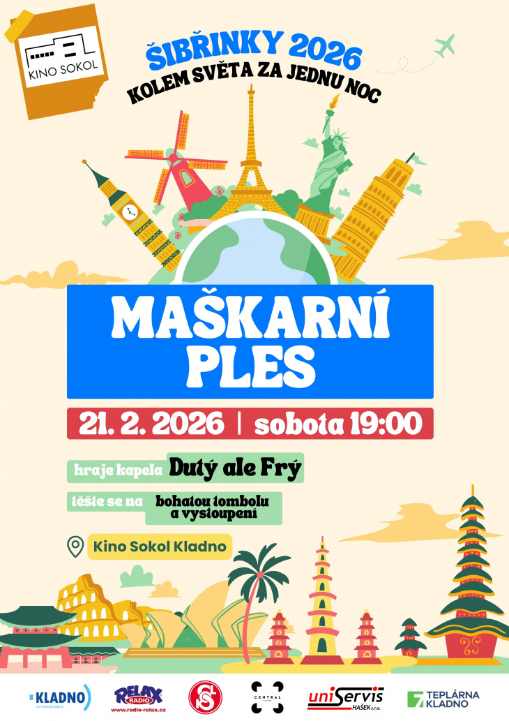 V sobotu 21. února vás srdečně zveme na tradiční maškarní ples v Kině Sokol Kladno, který vás letos vezme na cestu kolem světa. Přijďte si užít večer plný hudby, tance a skvělé atmosféry v maskách inspirovaných různými kouty planety. K tanci i poslechu zahraje kapela Dutý ale Frý. Těšit se můžete také na bohatou tombolu, vystoupení a příjemné posezení.