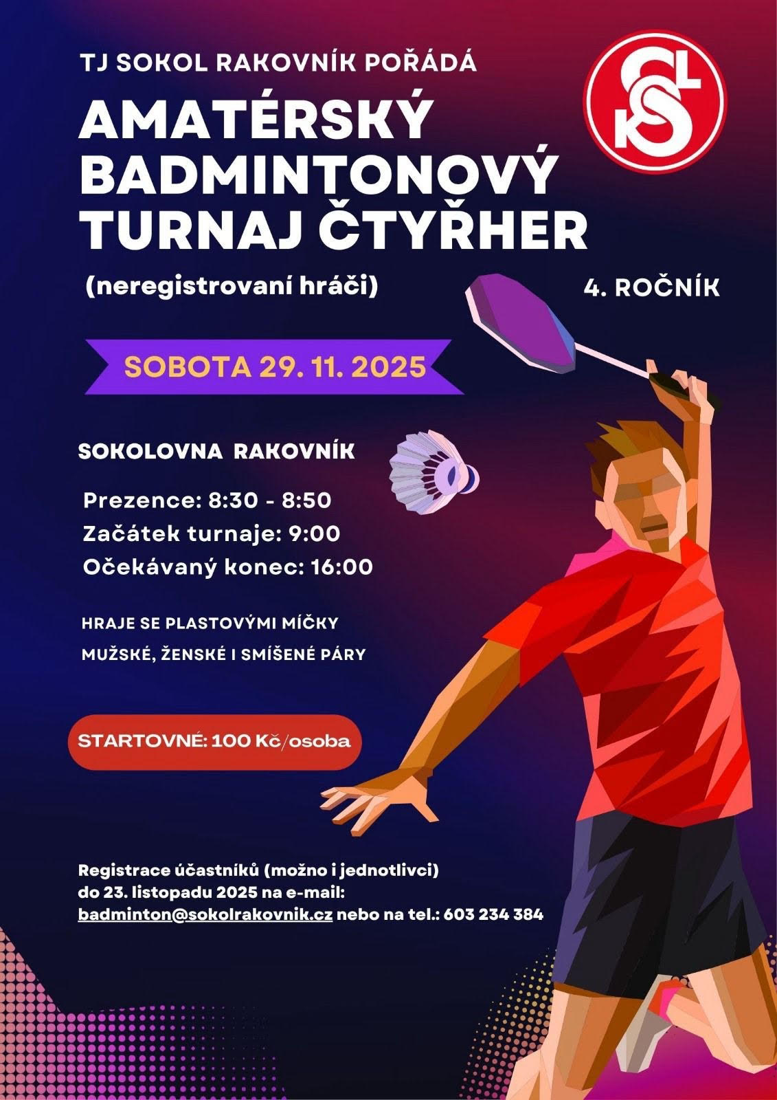 TJ Sokol Rakovník pořádá v sobotu 29. listopadu amatérský badmintonový turnaj čtyřher neregistrovaných hráčů. V rakovnické sokolovně se spolu utkají mužské, ženské i smíšené páry. Startovné činí 100 Kč/osobu, registrovat se můžete do 23. 11. prostřednictvím e-mailu badminton@sokolrakovnik.cz nebo telefonu 603 234 384.